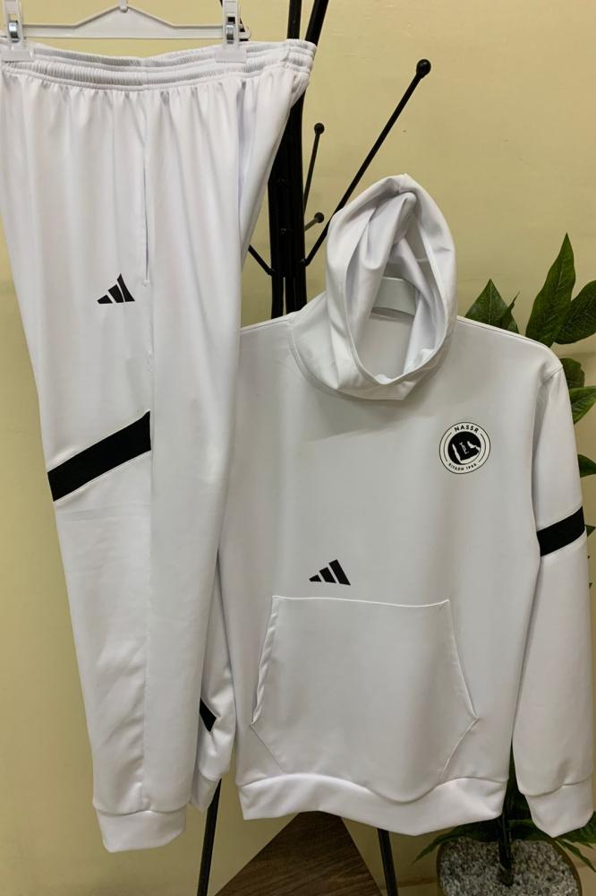 طقم النصر السعودي شتوي بلوفر ابيض مع سروال طويل شتوي مزين بشعار نادي النصر