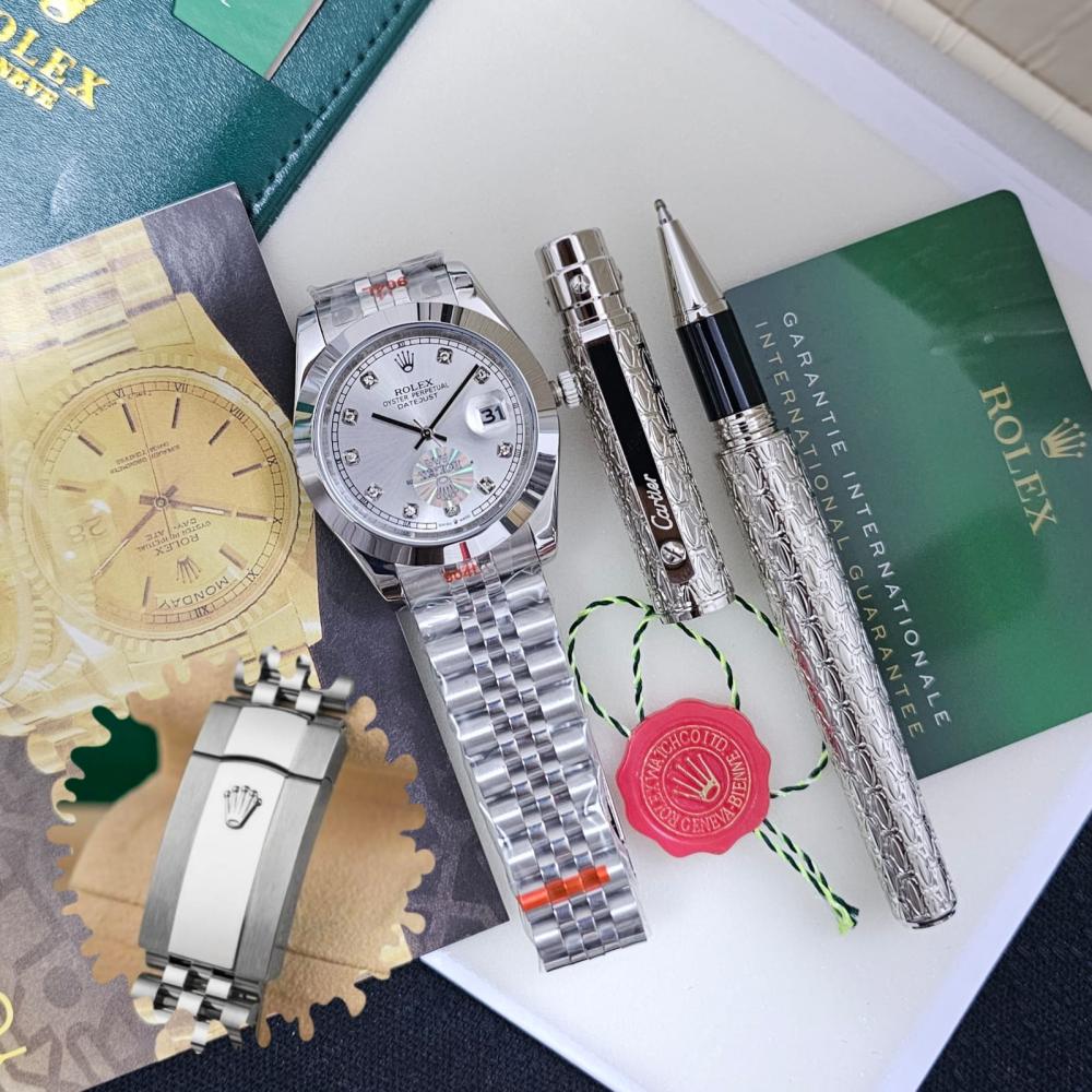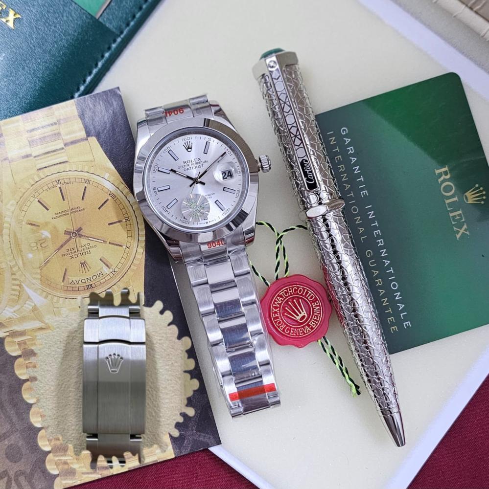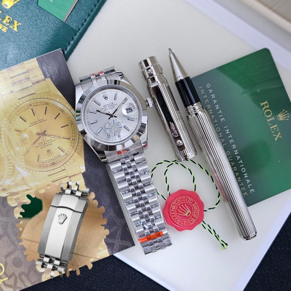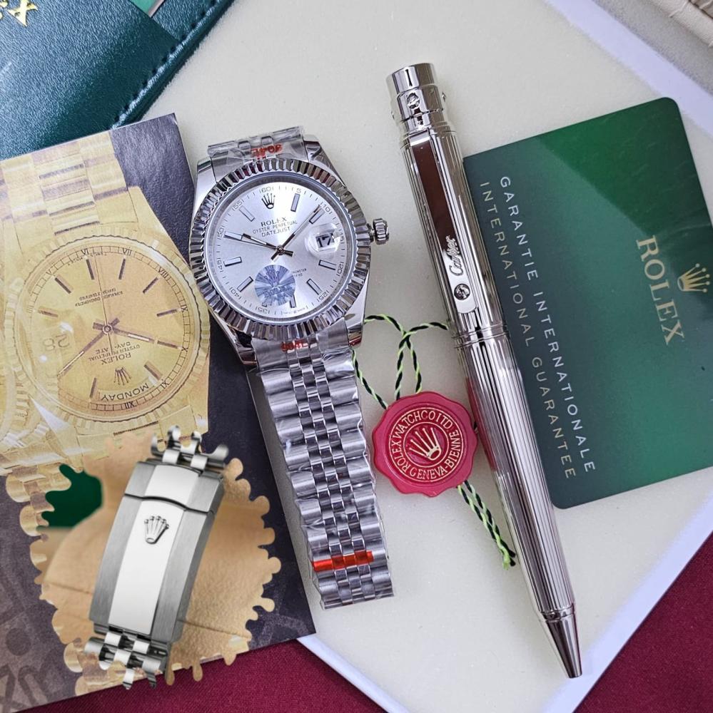 طقم ساعة رولكس مع قلم كارتير نحيف فضي