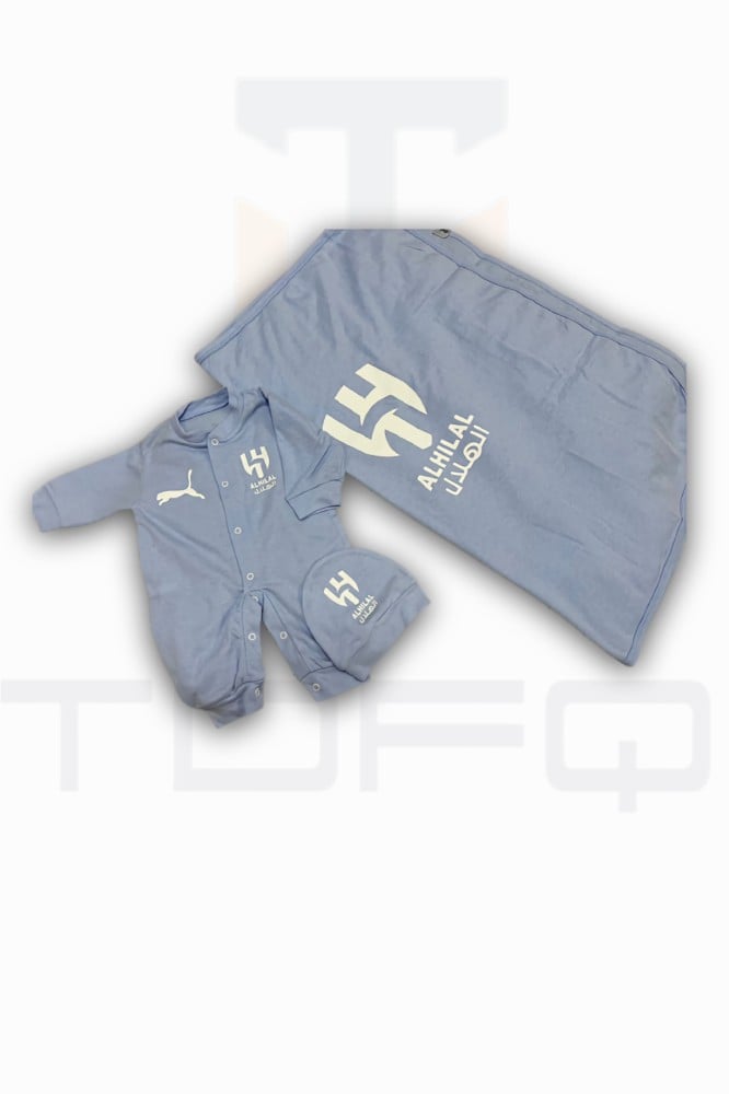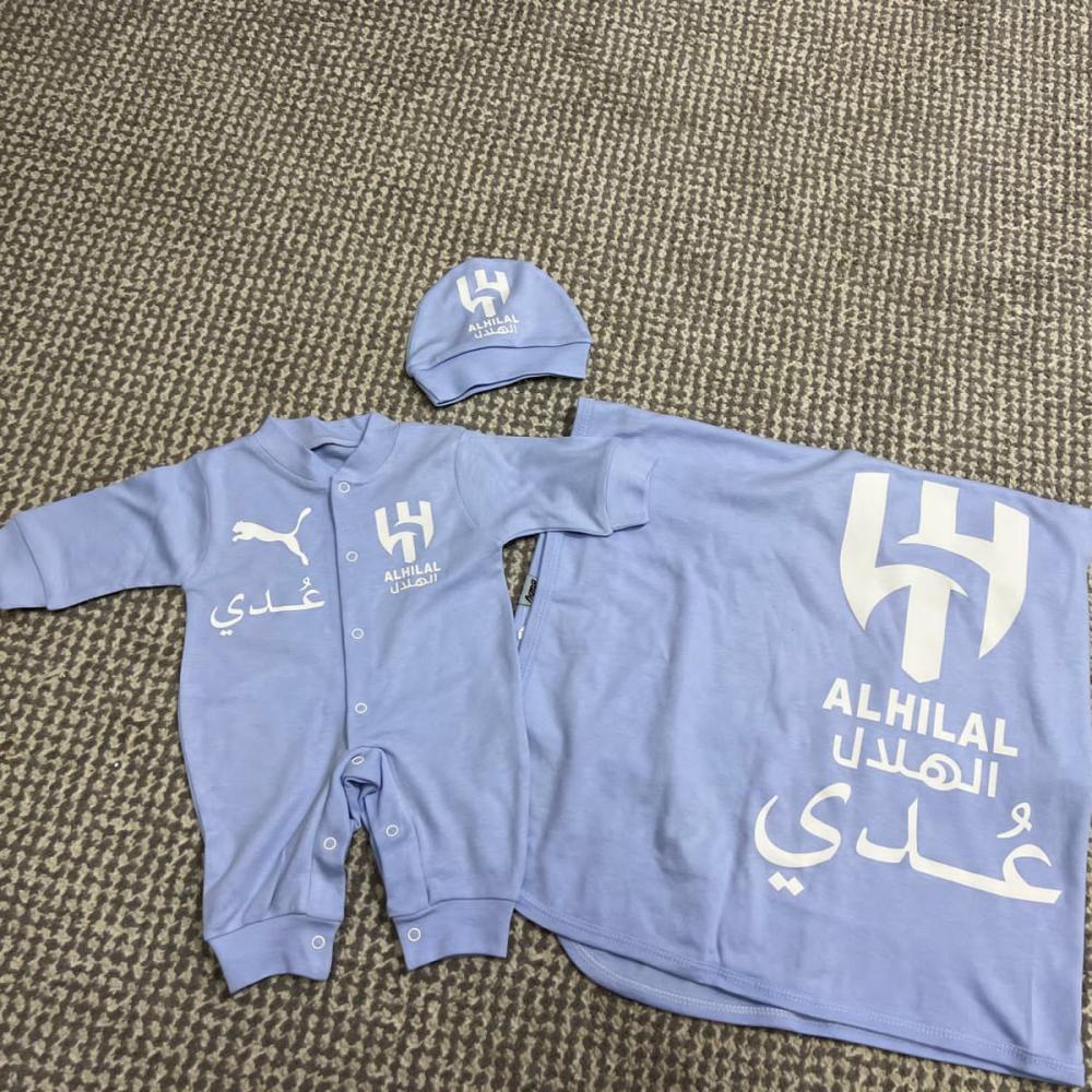 المقاس : متوفر بجميع المقاسات ( طقم مواليد بشعار نادي الهلال ) .