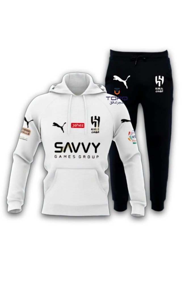 طقم نادي الهلال شتوي بلوفر ابيض مع سروال طويل بشعار نادي الهلال 2024