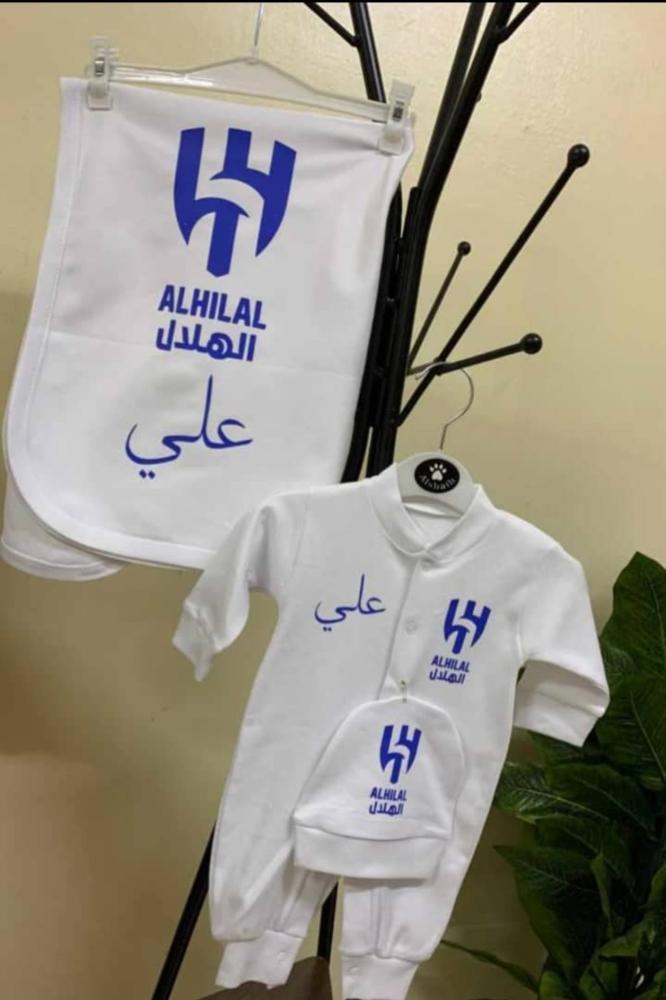 المقاس : متوفر بجميع المقاسات ( طقم مواليد بشعار نادي الهلال ) .