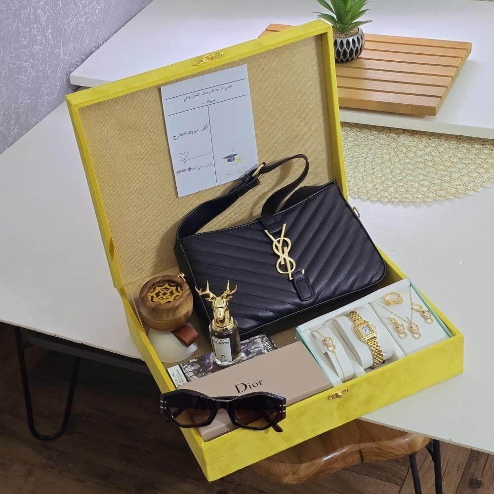 يحتوي على :شنطة ماركة اف سان لوران، نظارة قوتشي مع الملحقات، ساعة بتصميم كارتير بفصوص الزركون، طقم إكسسوار موسيكا، عطر الغزال 25 مل، فواحة برائحة اللافندر، مبخرة أنيقة، مع تغليف أنيق ومثالي للإهداء
